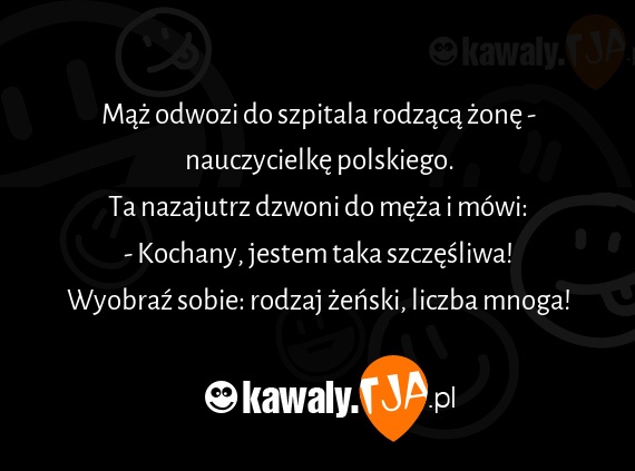 Mąż odwozi do szpitala rodzącą żonę - nauczycielkę polskiego. Ta nazajutrz dzwoni do męża i mówi: - Kochany, jestem taka szczęśliwa! Wyobraź sobie: rodzaj żeński, liczba mnoga!