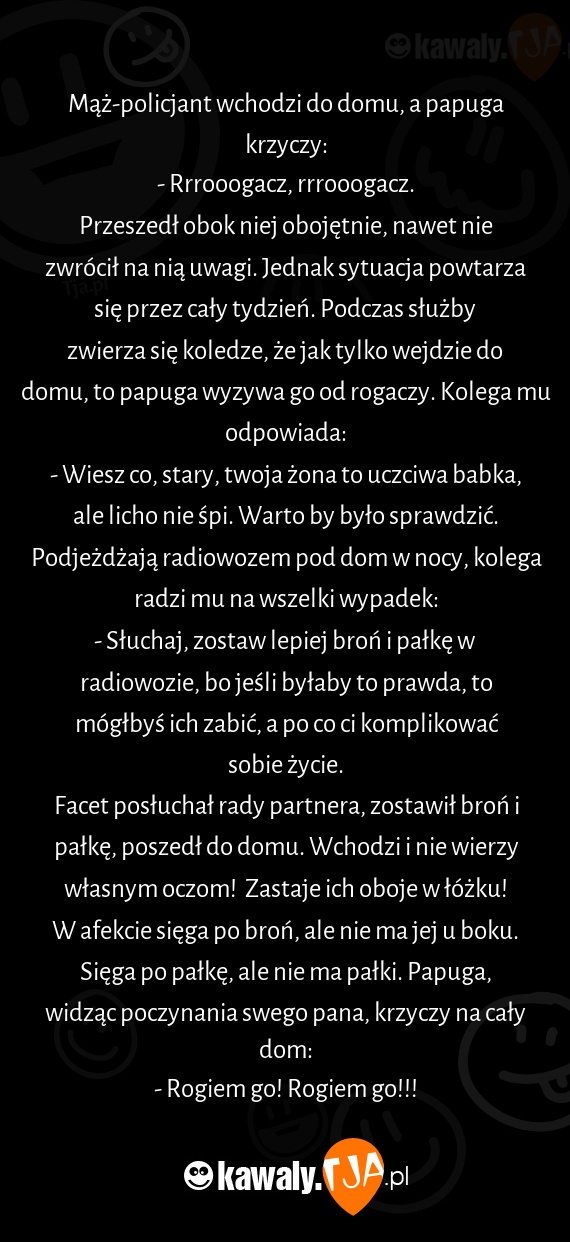 Przeszedł obok niej obojętnie, nawet nie zwrócił na nią uwagi. Jednak sytuacja powtarza się przez cały tydzień. Podczas służby zwierza się koledze, że jak tylko wejdzie do domu, to papuga wyzywa go od rogaczy. Kolega mu odpowiada: