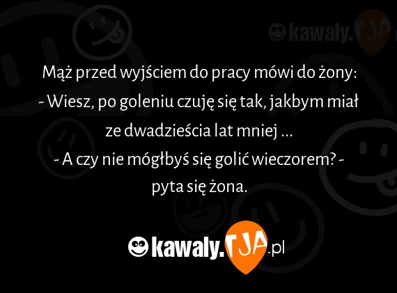 Mąż przed wyjściem do pracy mówi do żony: - Wiesz, po goleniu czuję się tak, jakbym miał ze dwadzieścia lat mniej ... - A czy nie mógłbyś się golić wieczorem? - pyta się żona.