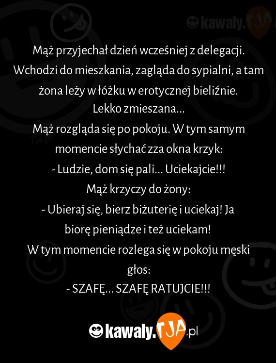 Mąż przyjechał dzień wcześniej z delegacji. Wchodzi do mieszkania, zagląda do sypialni, a tam żona leży w łóżku w erotycznej bieliźnie. Lekko zmieszana...