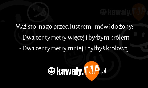 Maz stoi nago przed lustrem i mowi do zony: - Dwa centymetry wiecej i bylbym krolem - Dwa centymetry mniej i bylbys krolowa.