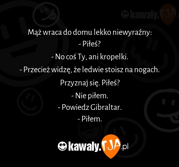 Mąż wraca do domu lekko niewyraźny: - Piłeś? - No coś Ty, ani kropelki. - Przecież widzę, że ledwie stoisz na nogach. Przyznaj się. Piłeś? - Nie piłem. - Powiedz Gibraltar. - Piłem.