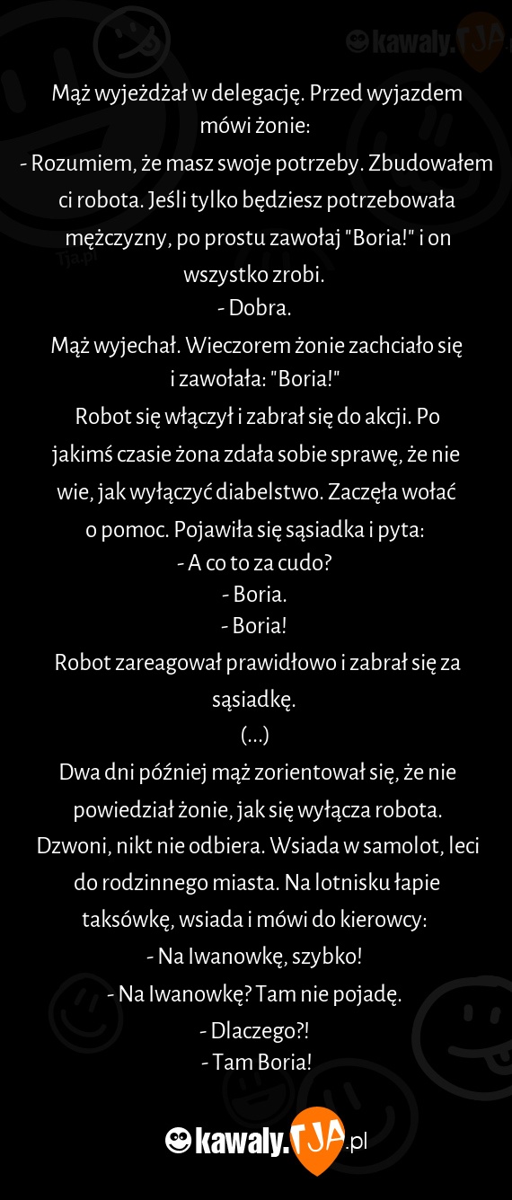- Rozumiem, że masz swoje potrzeby. Zbudowałem ci robota. Jeśli tylko będziesz potrzebowała mężczyzny, po prostu zawołaj "Boria!" i on wszystko zrobi.