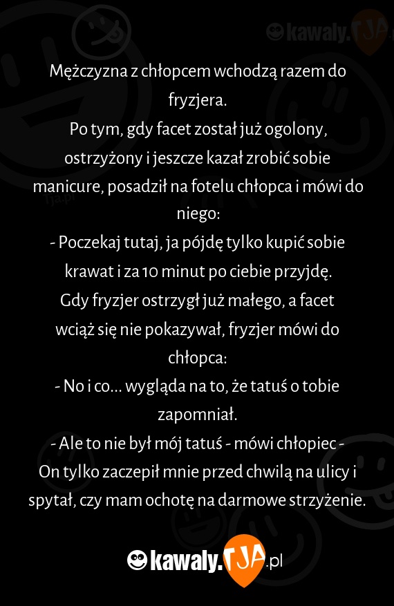 Gdy fryzjer ostrzygł już małego, a facet wciąż się nie pokazywał, fryzjer mówi do chłopca: