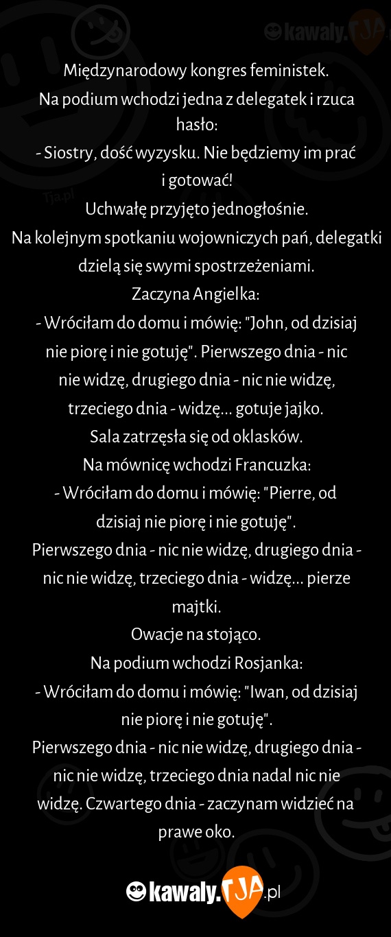 - Wróciłam do domu i mówię: "John, od dzisiaj nie piorę i nie gotuję". Pierwszego dnia - nic nie widzę, drugiego dnia - nic nie widzę, trzeciego dnia - widzę... gotuje jajko.