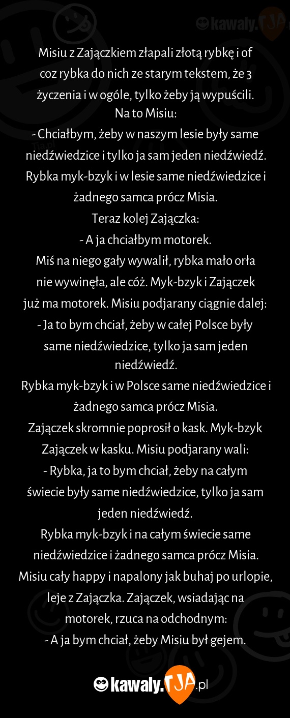 Misiu z Zajączkiem złapali złotą rybkę i of coz rybka do nich ze starym tekstem, że 3 życzenia i w ogóle, tylko żeby ją wypuścili. Na to Misiu: