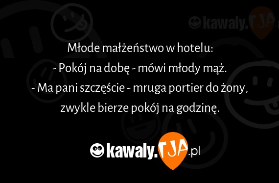 Młode małżeństwo w hotelu: - Pokój na dobę - mówi młody mąż. - Ma pani szczęście - mruga portier do żony, zwykle bierze pokój na godzinę.