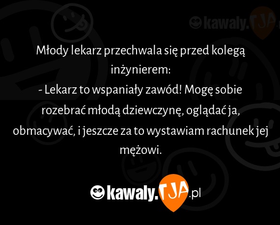 Mlody lekarz przechwala sie przed kolega inzynierem: - Lekarz to wspanialy zawod! Moge sobie rozebrac mloda dziewczyne, ogladac ja, obmacywac, i jeszcze za to wystawiam rachunek jej mezowi.