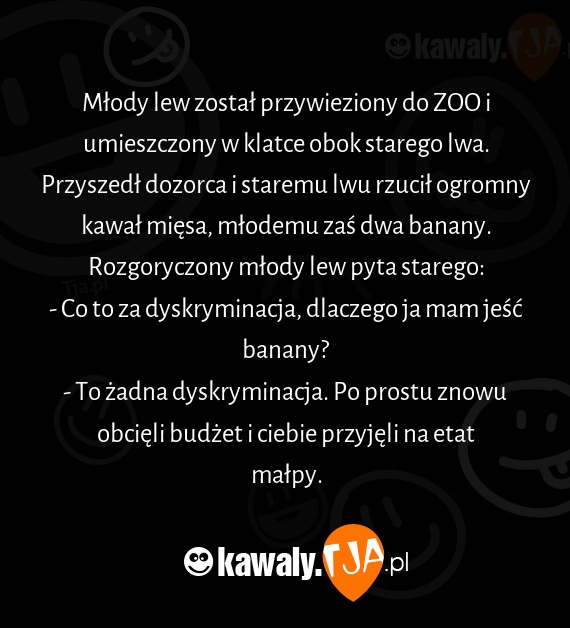 - To żadna dyskryminacja. Po prostu znowu obcięli budżet i ciebie przyjęli na etat małpy.