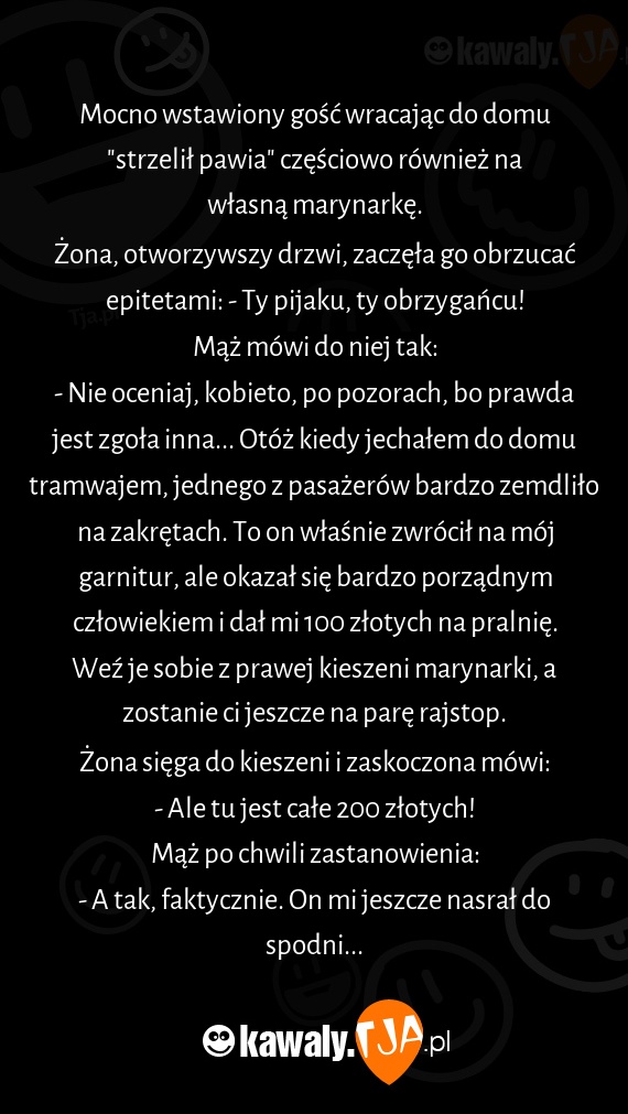 - Nie oceniaj, kobieto, po pozorach, bo prawda jest zgoła inna... Otóż kiedy jechałem do domu tramwajem, jednego z pasażerów bardzo zemdliło na zakrętach. To on właśnie zwrócił na mój garnitur, ale okazał się bardzo porządnym człowiekiem i dał mi 100 złotych na pralnię. Weź je sobie z prawej kieszeni marynarki, a zostanie ci jeszcze na parę rajstop.