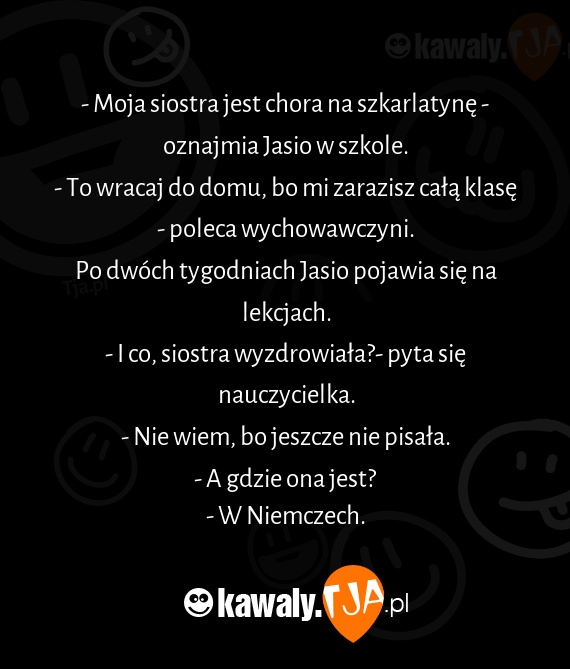 - Moja siostra jest chora na szkarlatynę - oznajmia Jasio w szkole.