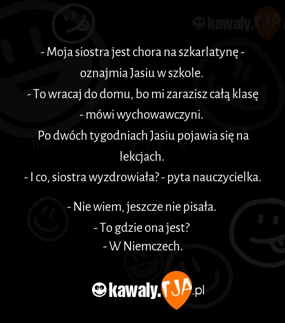 - Moja siostra jest chora na szkarlatynę - oznajmia Jasiu w szkole.