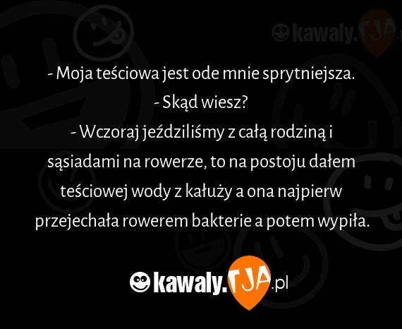 - Moja tesciowa jest ode mnie sprytniejsza. - Skad wiesz? - Wczoraj jexdzilismy z cala rodzina i sasiadami na rowerze, to na postoju dalem tesciowej wody z kaluzy a ona najpierw przejechala rowerem bakterie a potem wypila.