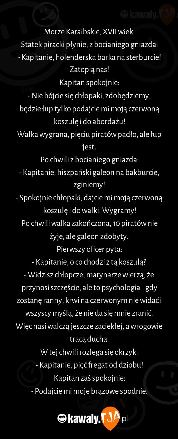 - Widzisz chłopcze, marynarze wierzą, że przynosi szczęście, ale to psychologia - gdy zostanę ranny, krwi na czerwonym nie widać i wszyscy myślą, że nie da się mnie zranić. Więc nasi walczą jeszcze zacieklej, a wrogowie tracą ducha.
