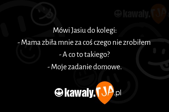 Mówi Jasiu do kolegi: - Mama zbiła mnie za coś czego nie zrobiłem - A co to takiego? - Moje zadanie domowe.