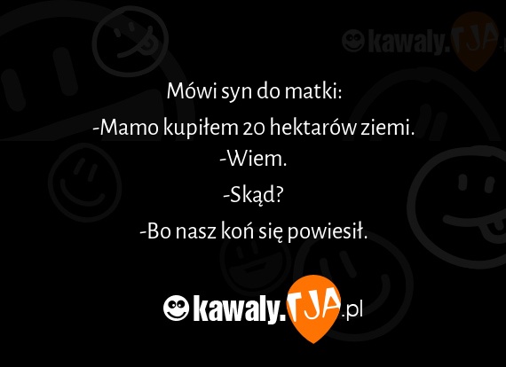 Mowi syn do matki: -Mamo kupilem 20 hektarow ziemi. -Wiem. -Skad? -Bo nasz kon sie powiesil.