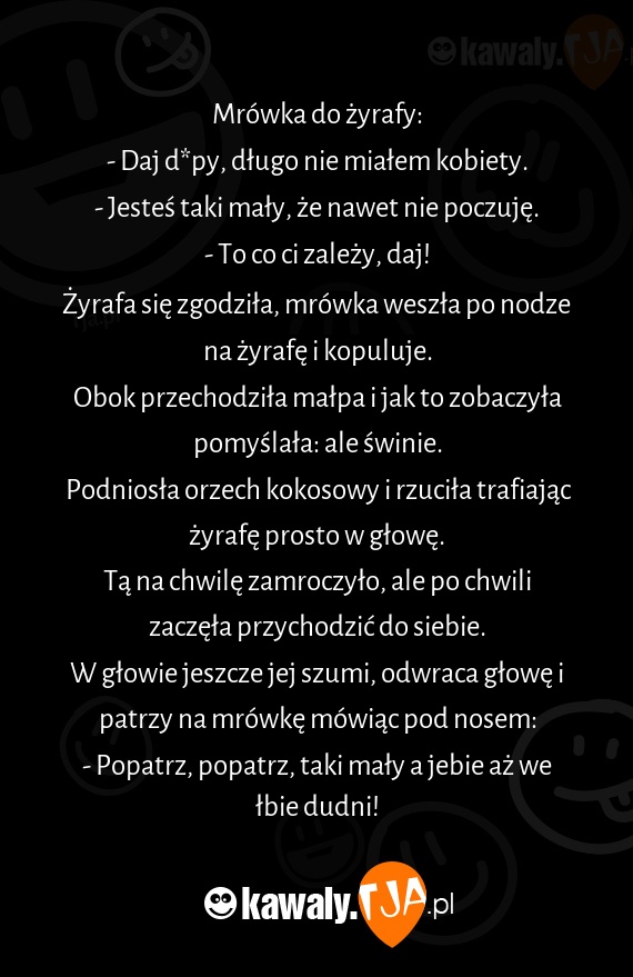 Żyrafa się zgodziła, mrówka weszła po nodze na żyrafę i kopuluje.