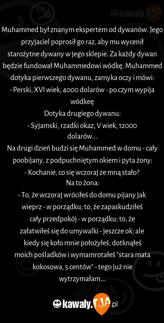 Muhammed był znanym ekspertem od dywanów. Jego przyjaciel poprosił go raz, aby mu wycenił starożytne dywany w jego sklepie. Za każdy dywan będzie fundował Muhammedowi wódkę. Muhammed dotyka pierwszego dywanu, zamyka oczy i mówi: