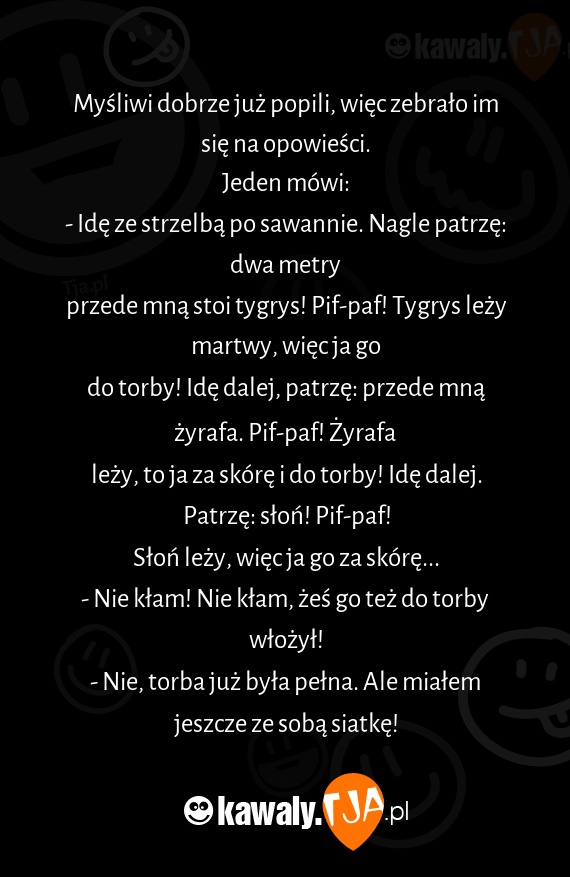 Myśliwi dobrze już popili, więc zebrało im się na opowieści.