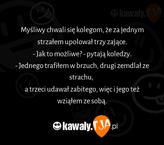 Myśliwy chwali się kolegom, że za jednym strzałem upolował trzy zające. - Jak to możliwe? - pytają koledzy. - Jednego trafiłem w brzuch, drugi zemdlał ze strachu, a trzeci udawał zabitego, więc i jego też wziąłem ze sobą.