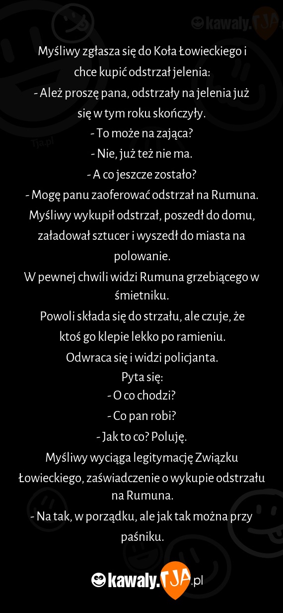 Myśliwy wykupił odstrzał, poszedł do domu, załadował sztucer i wyszedł do miasta na polowanie.