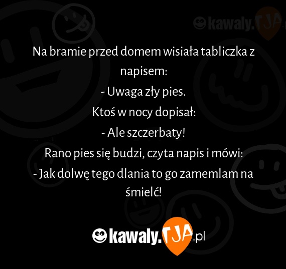 Na bramie przed domem wisiała tabliczka z napisem: - Uwaga zły pies. Ktoś w nocy dopisał: - Ale szczerbaty! Rano pies się budzi, czyta napis i mówi: - Jak dolwę tego dlania to go zamemlam na śmielć!