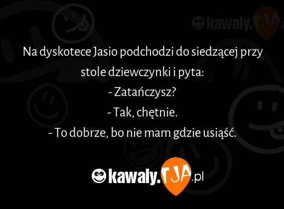 Na dyskotece Jasio podchodzi do siedzacej przy stole dziewczynki i pyta: - Zatanczysz? - Tak, chetnie. - To dobrze, bo nie mam gdzie usiasc.