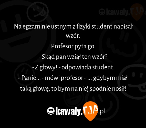 Na egzaminie ustnym z fizyki student napisał wzór. Profesor pyta go: - Skąd pan wziął ten wzór? - Z głowy! - odpowiada student. - Panie... - mówi profesor - ... gdybym miał taką głowę, to bym na niej spodnie nosił!