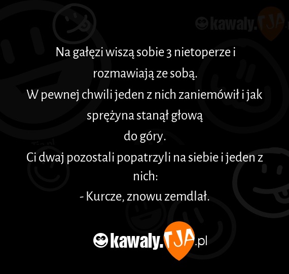 Na gałęzi wiszą sobie 3 nietoperze i rozmawiają ze sobą. W pewnej chwili jeden z nich zaniemówił i jak sprężyna stanął głową do góry. Ci dwaj pozostali popatrzyli na siebie i jeden z nich: - Kurcze, znowu zemdlał.