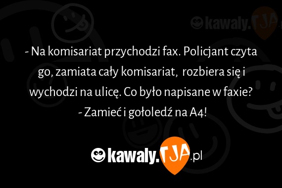 - Na komisariat przychodzi fax. Policjant czyta go, zamiata cały komisariat, rozbiera się i wychodzi na ulicę. Co było napisane w faxie? - Zamieć i gołoledź na A4!