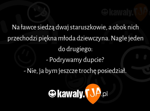 Na ławce siedzą dwaj staruszkowie, a obok nich przechodzi piękna młoda dziewczyna. Nagle jeden do drugiego: - Podrywamy dupcie? - Nie, ja bym jeszcze trochę posiedział.
