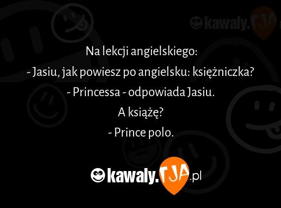 Na lekcji angielskiego: - Jasiu, jak powiesz po angielsku: księżniczka? - Princessa - odpowiada Jasiu. A książę? - Prince polo.