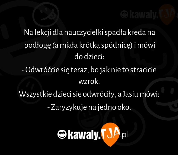 Na lekcji dla nauczycielki spadla kreda na podloge (a miala krotka spodnice) i mowi do dzieci: - Odwroccie sie teraz, bo jak nie to stracicie wzrok. Wszystkie dzieci sie odwrocily, a Jasiu mowi: - Zaryzykuje na jedno oko.