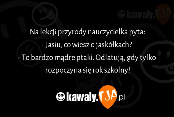 Na lekcji przyrody nauczycielka pyta: - Jasiu, co wiesz o jaskolkach? - To bardzo madre ptaki. Odlatuja, gdy tylko rozpoczyna sie rok szkolny!
