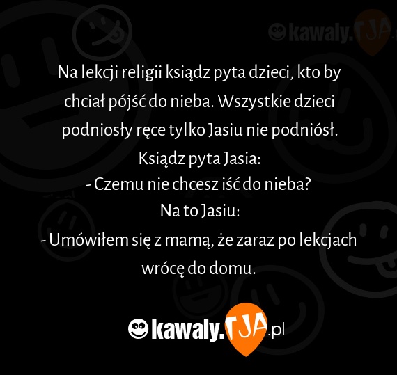 Na lekcji religii ksiądz pyta dzieci, kto by chciał pójść do nieba. Wszystkie dzieci podniosły ręce tylko Jasiu nie podniósł. Ksiądz pyta Jasia: - Czemu nie chcesz iść do nieba? Na to Jasiu: - Umówiłem się z mamą, że zaraz po lekcjach wrócę do domu.