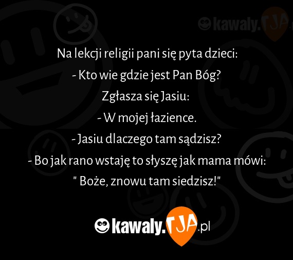 Na lekcji religii pani sie pyta dzieci: - Kto wie gdzie jest Pan Bog? Zglasza sie Jasiu: - W mojej lazience. - Jasiu dlaczego tam sadzisz? - Bo jak rano wstaje to slysze jak mama mowi: " Boze, znowu tam siedzisz!"