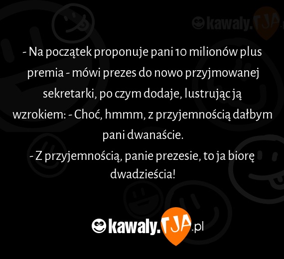 - Na początek proponuje pani 10 milionów plus premia - mówi prezes do nowo przyjmowanej sekretarki, po czym dodaje, lustrując ją wzrokiem: - Choć, hmmm, z przyjemnością dałbym pani dwanaście.