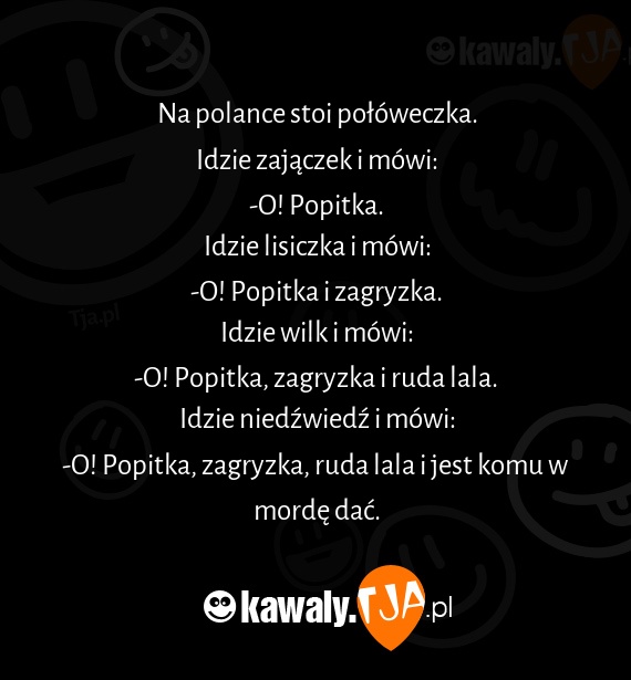 Na polance stoi poloweczka. Idzie zajaczek i mowi: -O! Popitka. Idzie lisiczka i mowi: -O! Popitka i zagryzka. Idzie wilk i mowi: -O! Popitka, zagryzka i ruda lala. Idzie niedxwiedx i mowi: -O! Popitka, zagryzka, ruda lala i jest komu w morde dac.