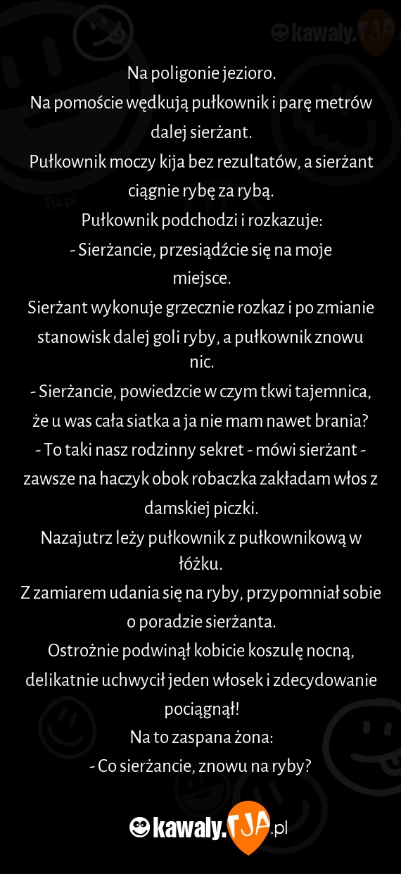 - Sierżancie, powiedzcie w czym tkwi tajemnica, że u was cała siatka a ja nie mam nawet brania?