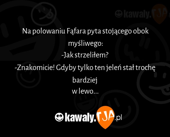 Na polowaniu Fafara pyta stojacego obok mysliwego: -Jak strzelilem? -Znakomicie! Gdyby tylko ten jelen stal troche bardziej w lewo...