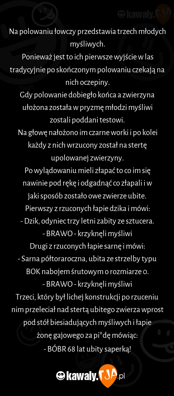 Trzeci, który był lichej konstrukcji po rzuceniu nim przeleciał nad stertą ubitego zwierza wprost pod stół biesiadujących myśliwych i łapie żonę gajowego za pizdę mówiąc: