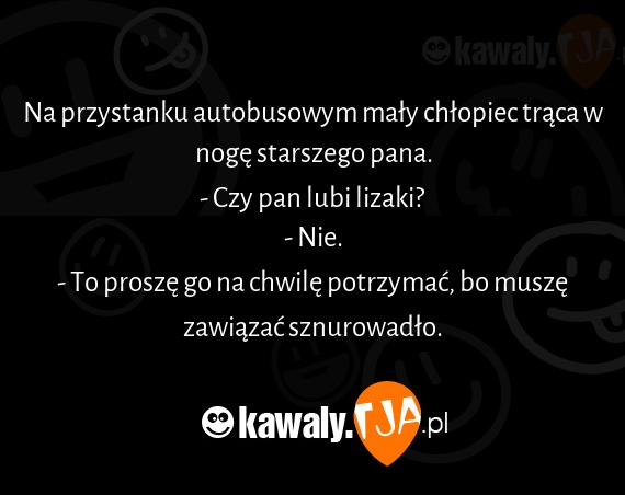 Na przystanku autobusowym mały chłopiec trąca w nogę starszego pana. - Czy pan lubi lizaki? - Nie. - To proszę go na chwilę potrzymać, bo muszę zawiązać sznurowadło.
