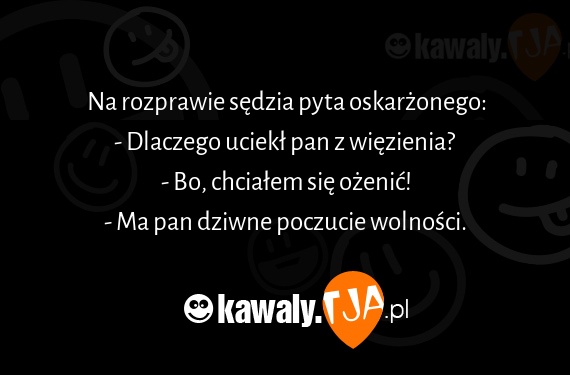 Na rozprawie sędzia pyta oskarżonego: - Dlaczego uciekł pan z więzienia? - Bo, chciałem się ożenić! - Ma pan dziwne poczucie wolności.