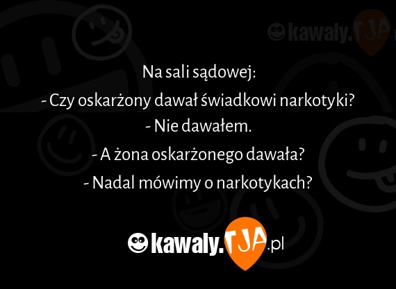 Na sali sadowej: - Czy oskarzony dawal swiadkowi narkotyki? - Nie dawalem. - A zona oskarzonego dawala? - Nadal mowimy o narkotykach?