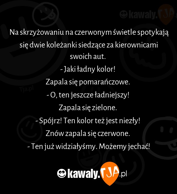 Na skrzyżowaniu na czerwonym świetle spotykają się dwie koleżanki siedzące za kierownicami swoich aut.