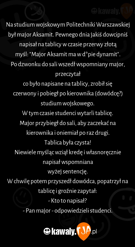 Na studium wojskowym Politechniki Warszawskiej był major Aksamit. Pewnego dnia jakiś dowcipniś napisał na tablicy w czasie przerwy złotą myśl: "Major Aksamit ma w d*pie dynamit".