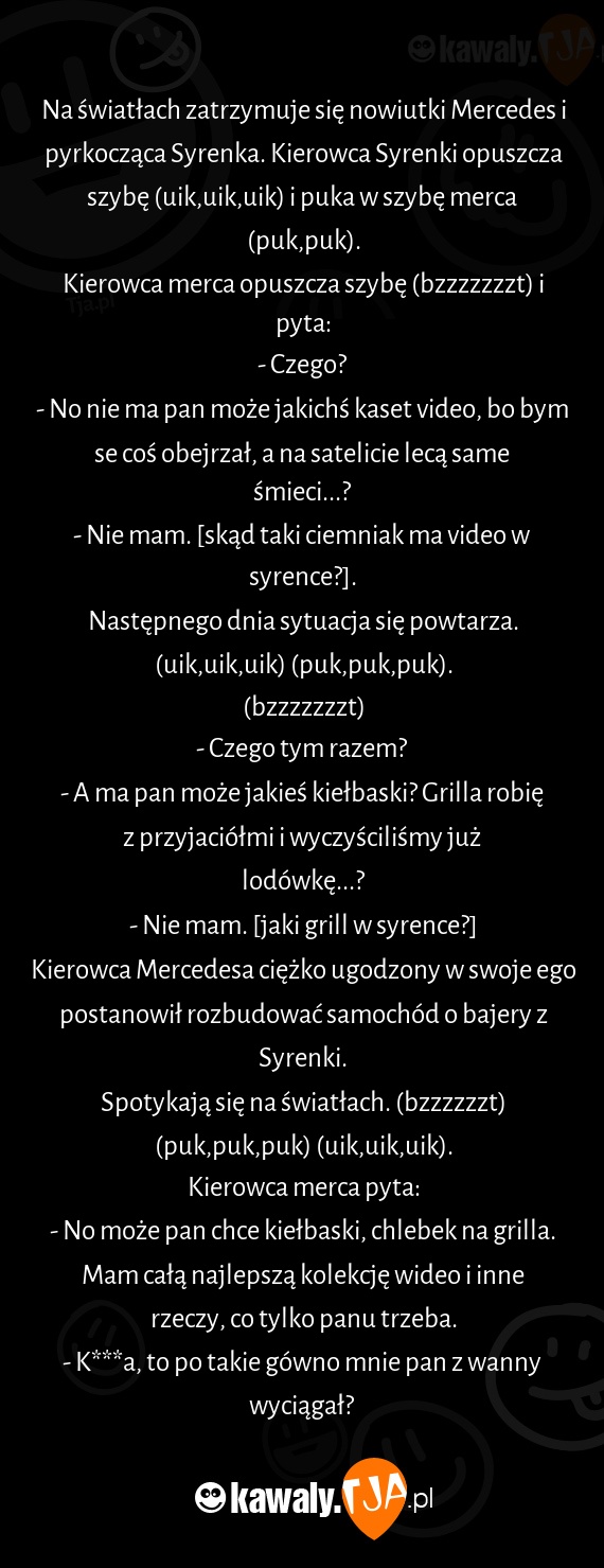 Na światłach zatrzymuje się nowiutki Mercedes i pyrkocząca Syrenka. Kierowca Syrenki opuszcza szybę (uik,uik,uik) i puka w szybę merca (puk,puk).