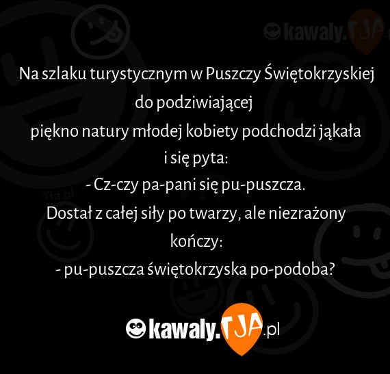 Na szlaku turystycznym w Puszczy Swietokrzyskiej do podziwiajacej piekno natury mlodej kobiety podchodzi jakala i sie pyta: - Cz-czy pa-pani sie pu-puszcza. Dostal z calej sily po twarzy, ale niezrazony konczy: - pu-puszcza swietokrzyska po-podoba?