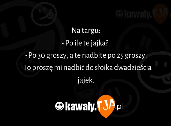 Na targu: - Po ile te jajka? - Po 30 groszy, a te nadbite po 25 groszy. - To prosze mi nadbic do sloika dwadziescia jajek.