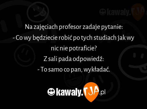 Na zajeciach profesor zadaje pytanie: - Co wy bedziecie robic po tych studiach jak wy nic nie potraficie? Z sali pada odpowiedx: - To samo co pan, wykladac.